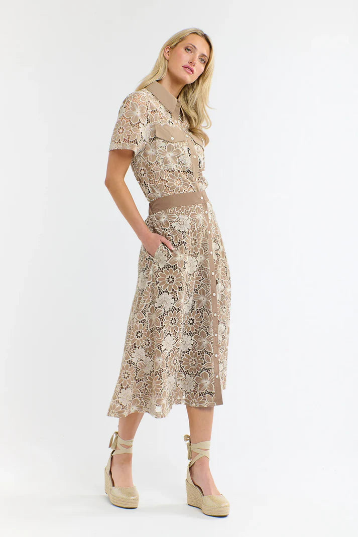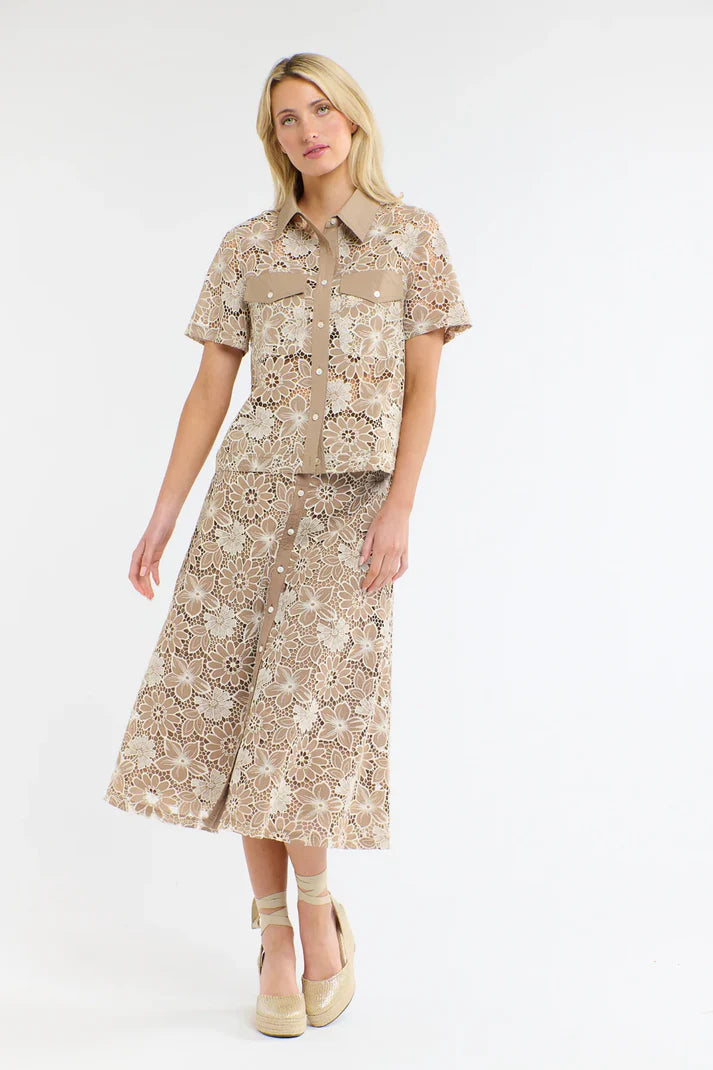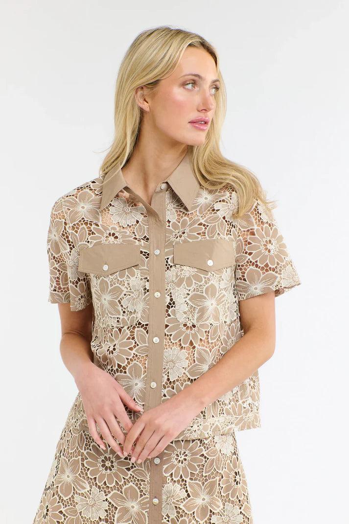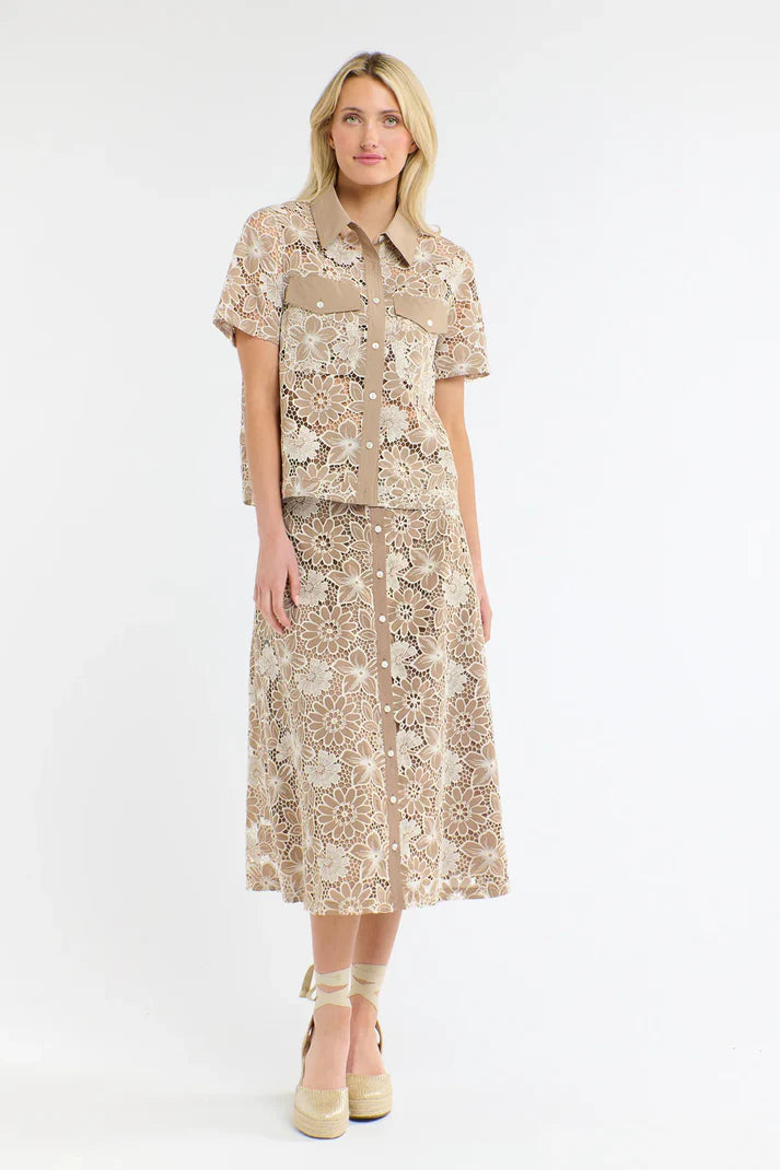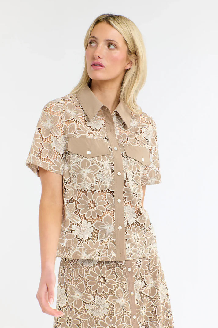 Such a gorgeous statement shirt style jacket in beautiful cutwork embroidery lace detail. Easy to wear, contrast standard collar and front with full button through.