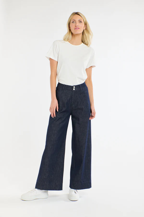 The Mayfair Denim Pants offer an easy elegance you'll reach for on repeat. Cut with a wide-leg silhouette and clean waistband, they lengthen the leg while delivering all-day comfort thanks to soft cotton with a touch of stretch. Pair with a tucked blouse or relaxed knit for a look that moves effortlessly from desk to dinner.