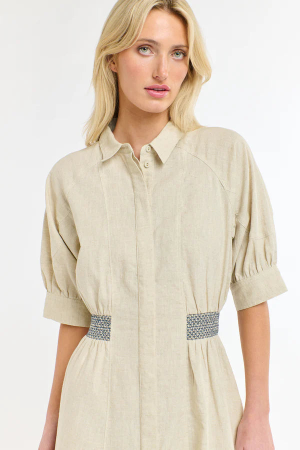 Effortlessly chic and oh so comfy, the Peggy Dress in Natural Linen is a must have for you wardrobe. This shirt dress features, collar, front buttons, short sleeve with cuff, side pockets and elastic contrast stitching at waist. This dress effortlessly combines fashion and function. Perfect for any occasion!