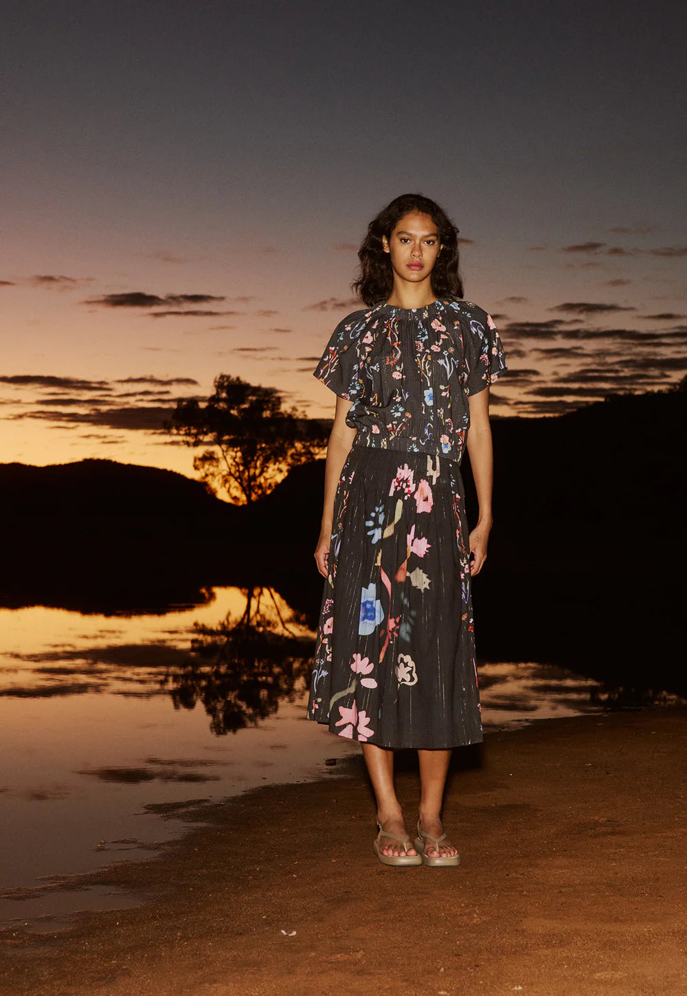 The Alma Yoke skirt in soft cotton with a subtle lurex stripe, and delicate pin tucks.