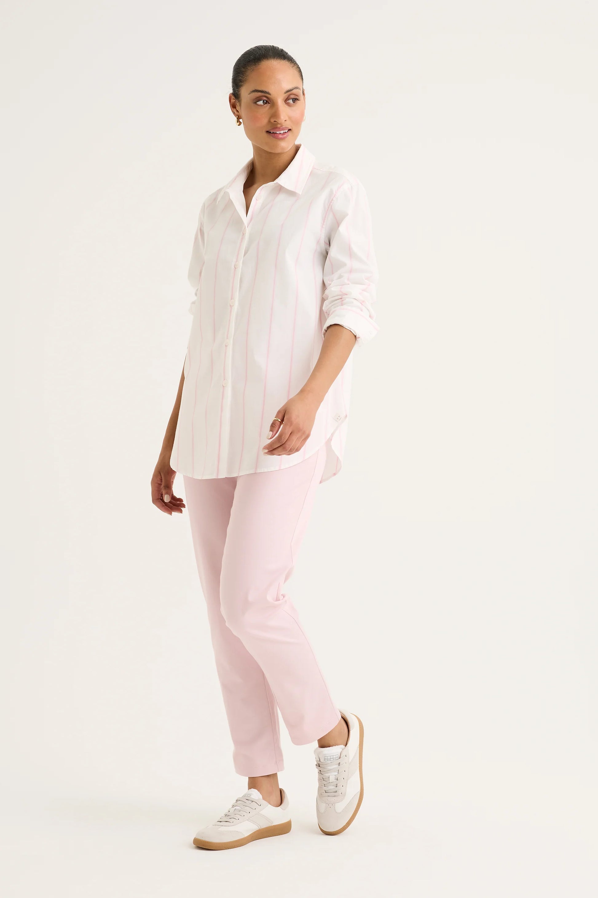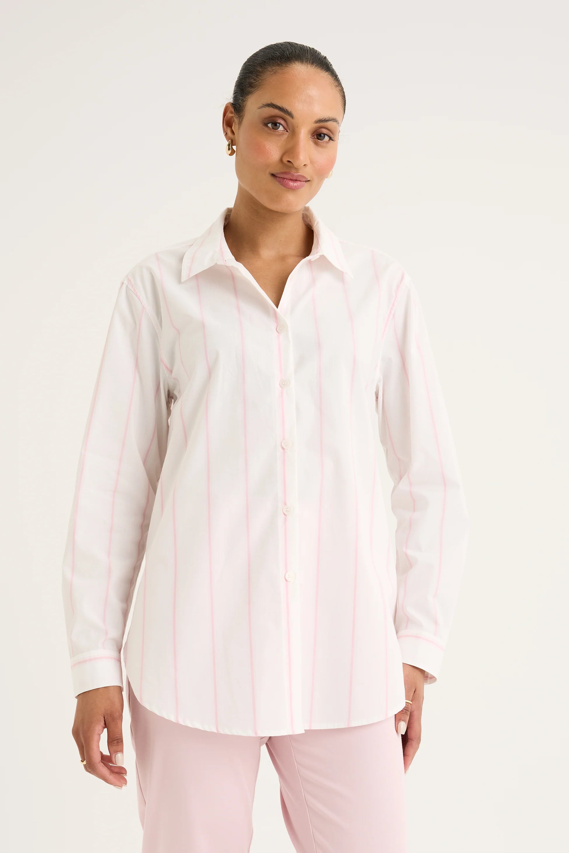 The Alloy Shirt is designed to stand out with its eye-catching stripes and crisp shirt collar. The button-through front and long sleeves with cuffs and placket add a refined touch, while the dual curved hem enhances the relaxed fit. Perfect for both casual and smart looks, pair it with jeans for a laid-back style, or tuck it into tailored trousers for a polished outfit. Layer it under a blazer for a sleek, modern look, or wear it open over a simple tee for a more relaxed vibe.