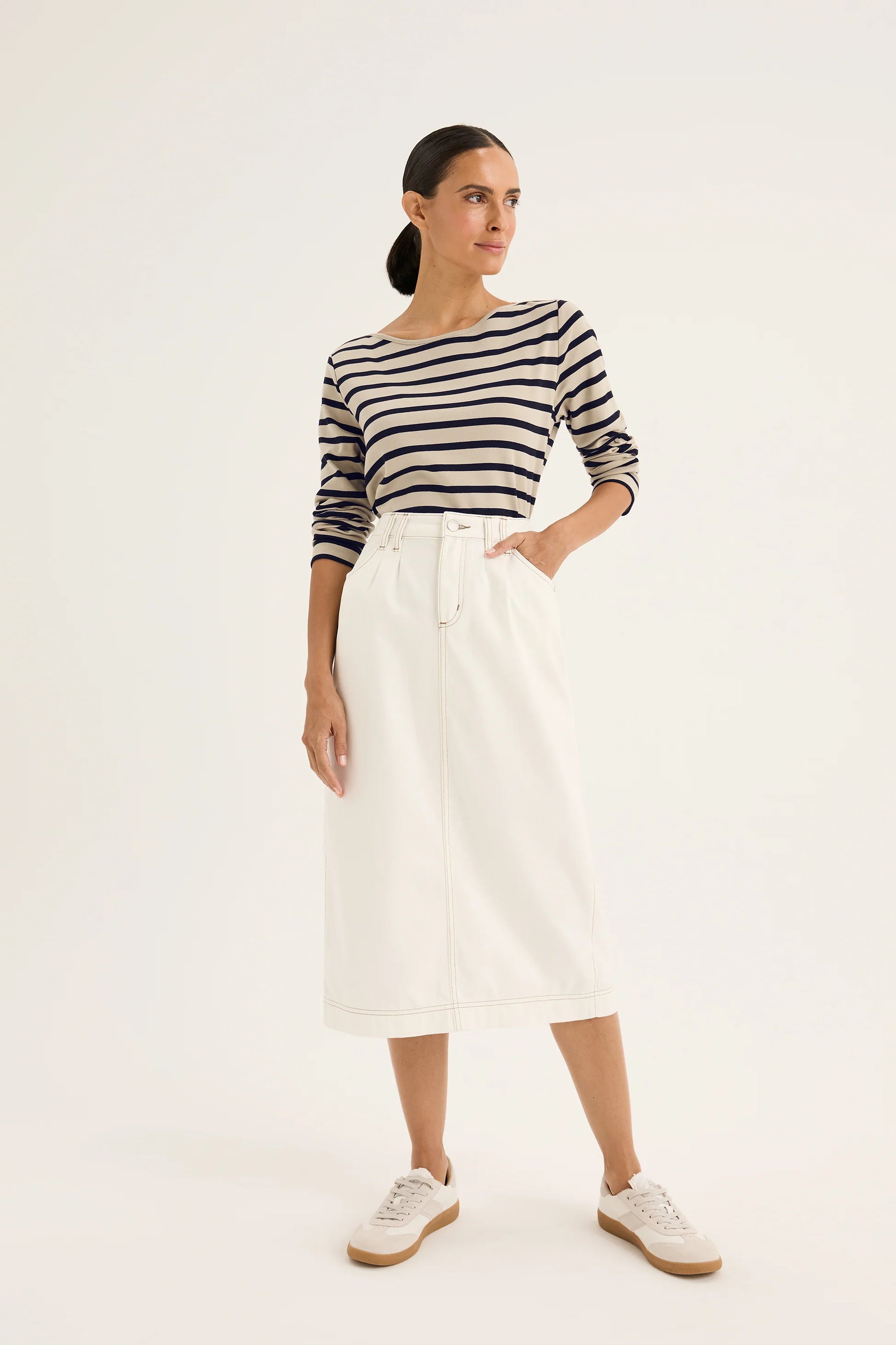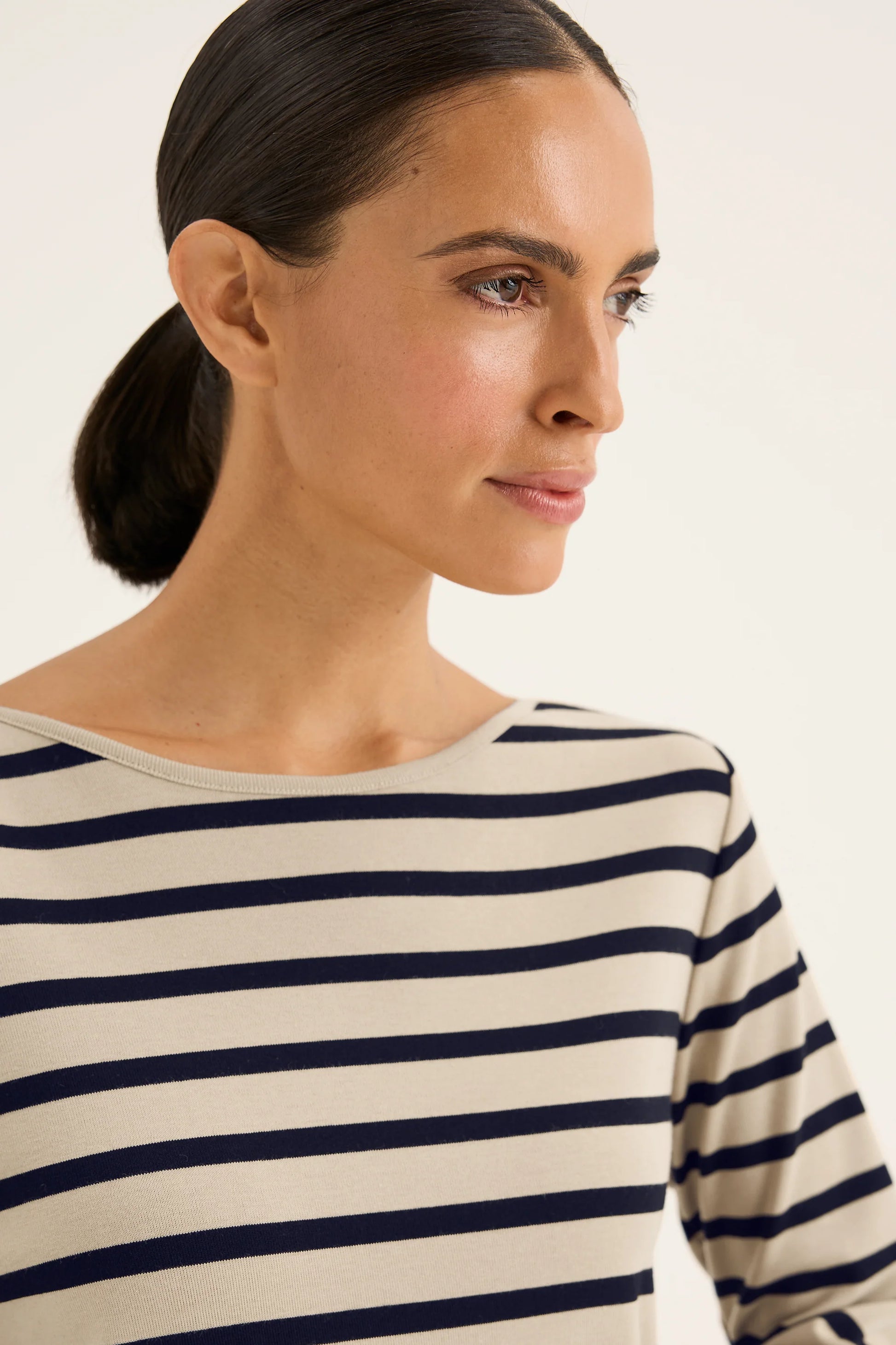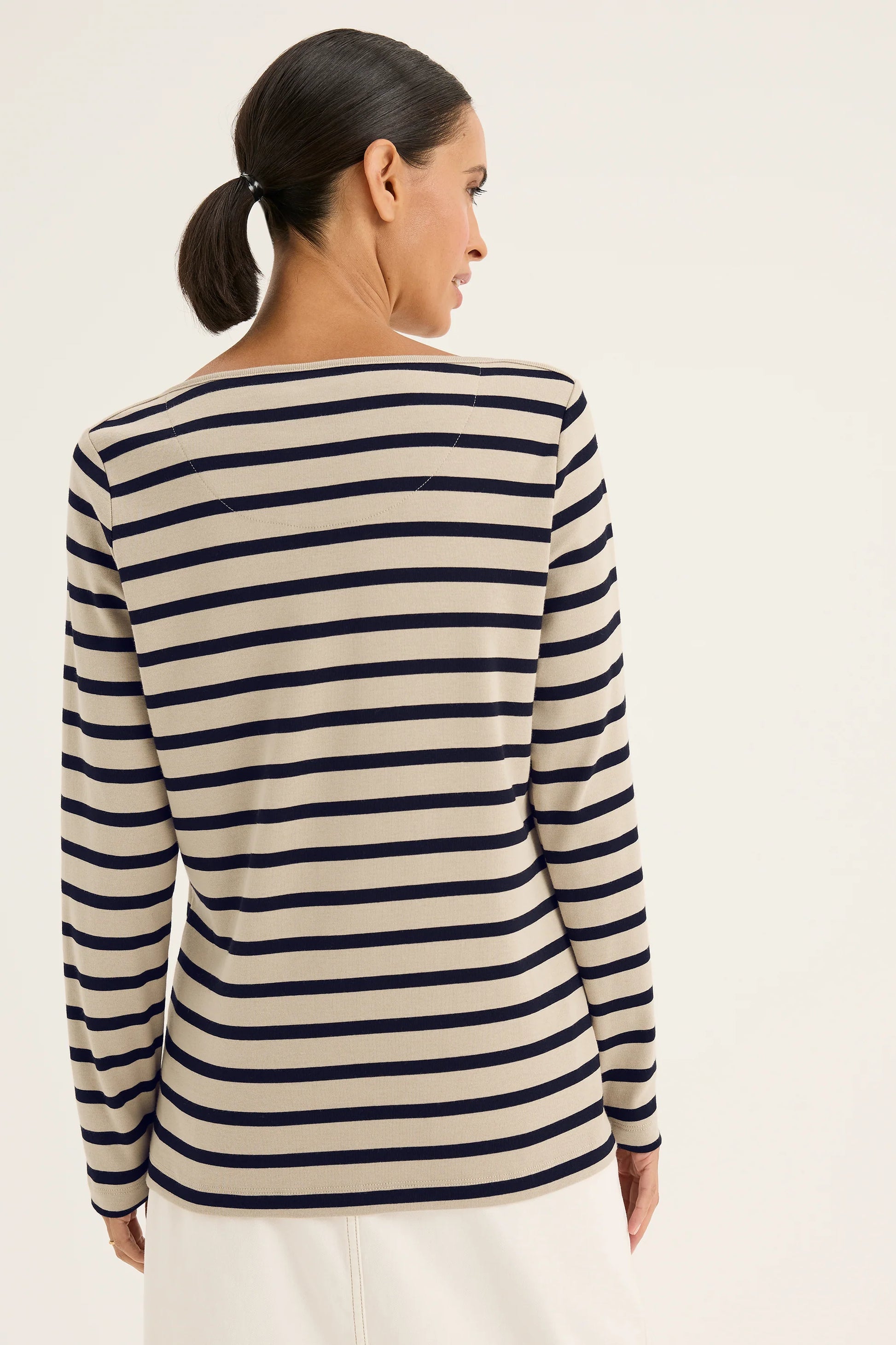 The Boardwalk Tee is an enduring essential, crafted from 100% Cotton for comfort. The tee stands out with its slender stripes, enhancing chic and appealing touch. Boat neckline and long sleeves ensure its sleek and timeless designs. Semi-fitted profile is effortless for a styling and layering option. Pair it with any piece in your wardrobe for an attractive winter look.