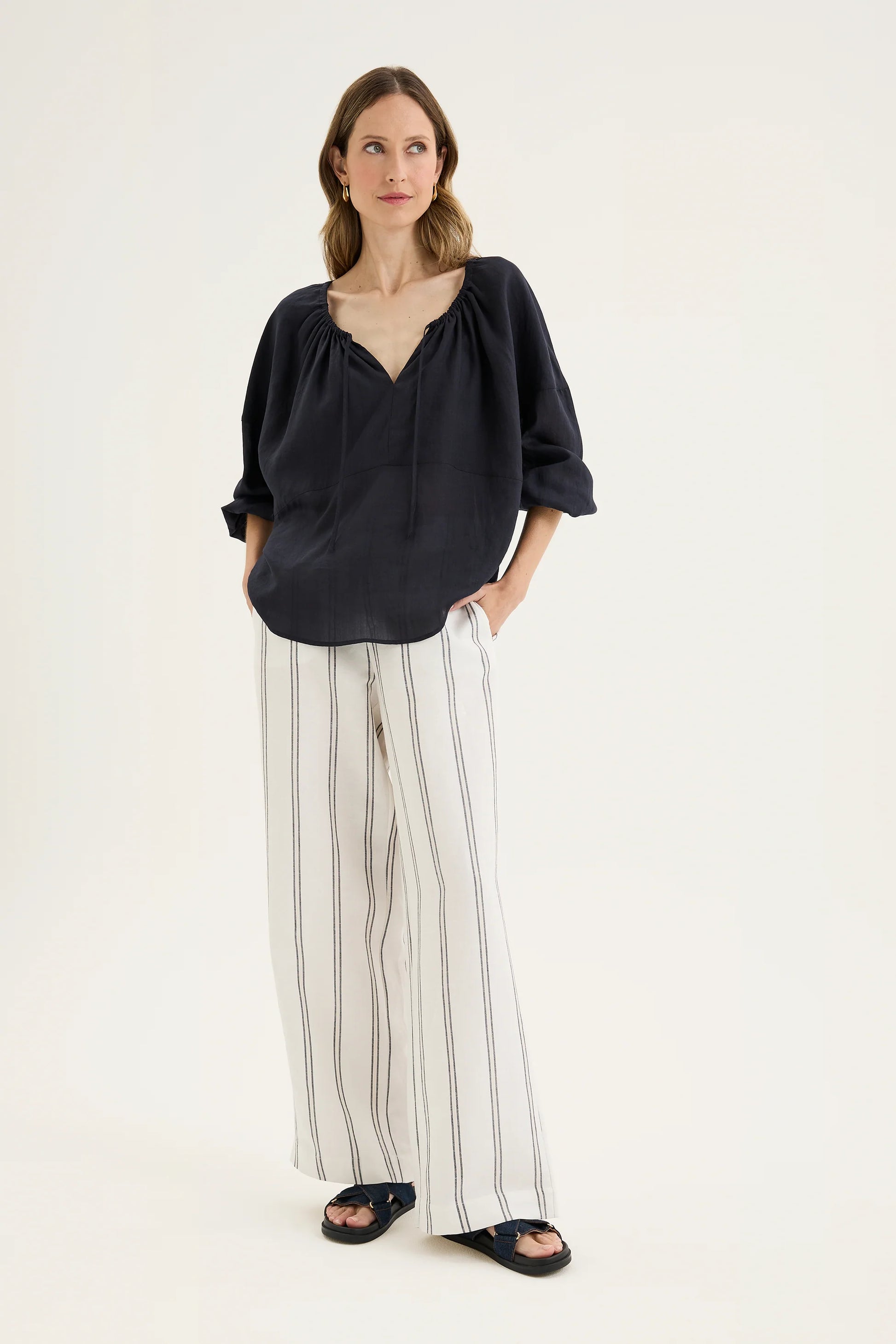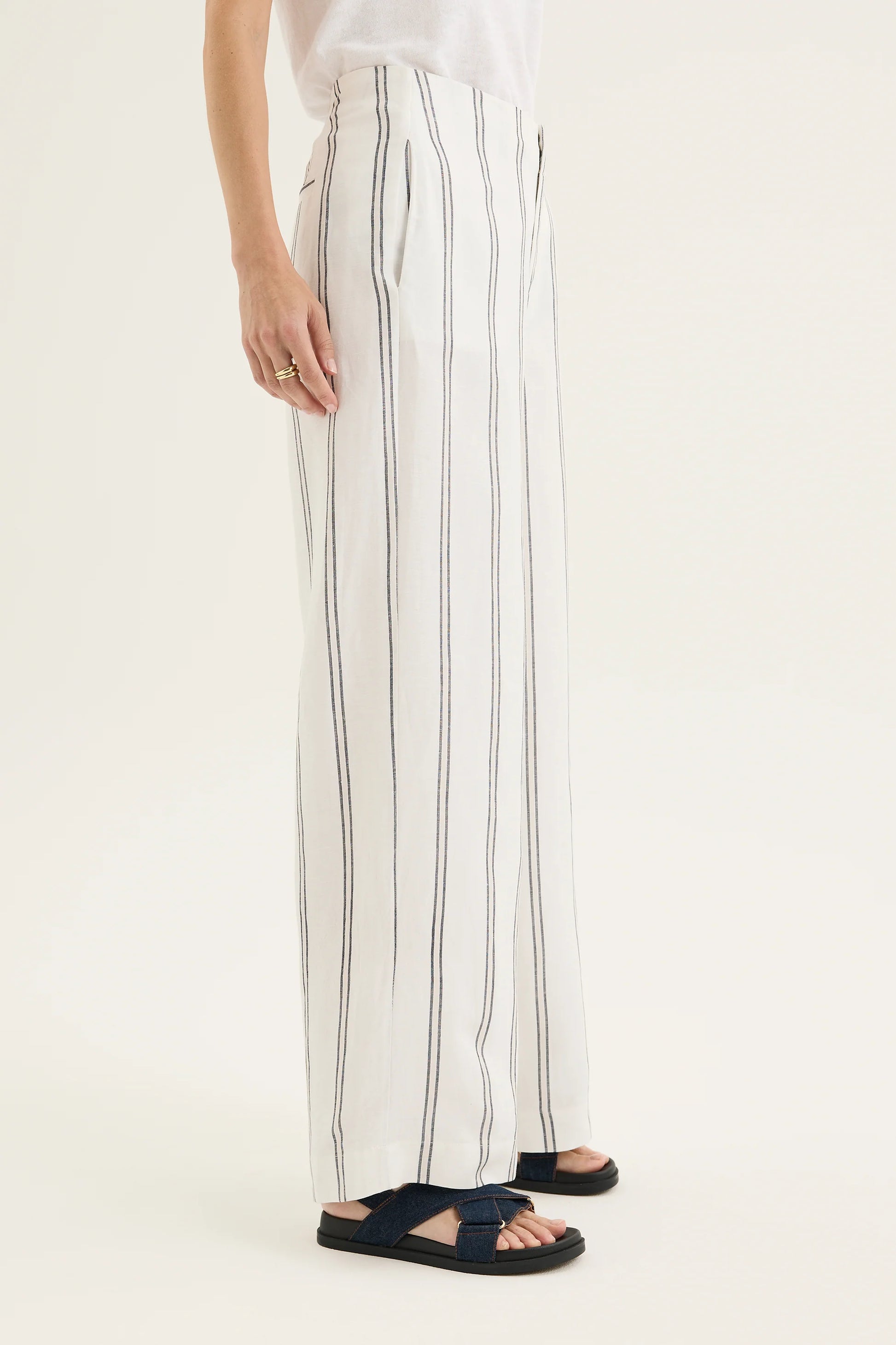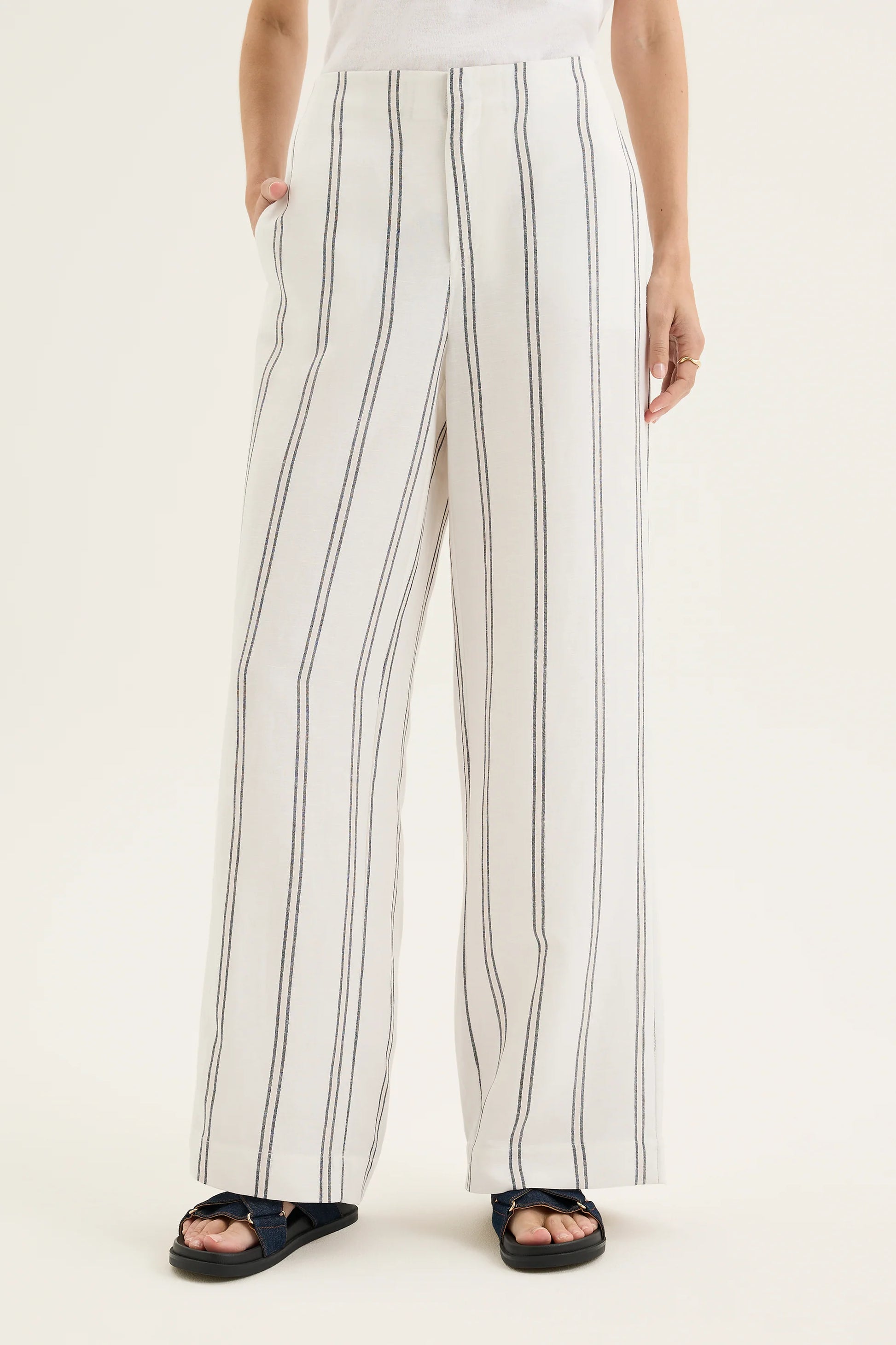 The kind of pant you’ll rely on for polished, effortless days, the Fugitive Pant is cut from a soft linen-viscose blend, woven with an exclusive yarn-dyed vertical stripe. A semi-elasticated back waistband ensures comfort and gentle stretch on any body type, while the front fly and discreet hook-and-bar closure keep the waistband looking tailored and refined. The pants offer function without bulk, with both front in-seam pockets and back welt pockets for a clean finish. Based on our bestselling Paris Pant, this wide-leg style feels instantly familiar -