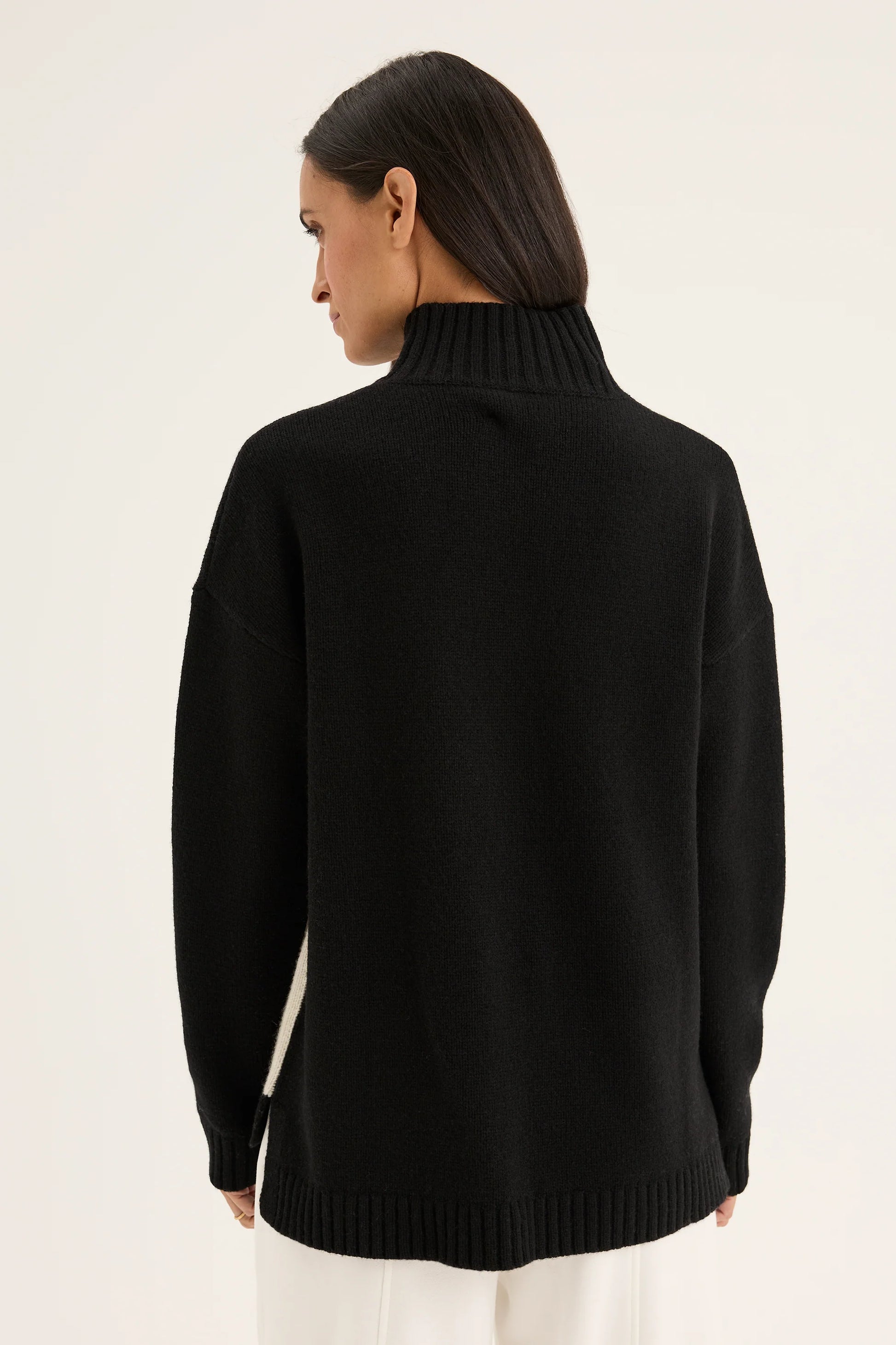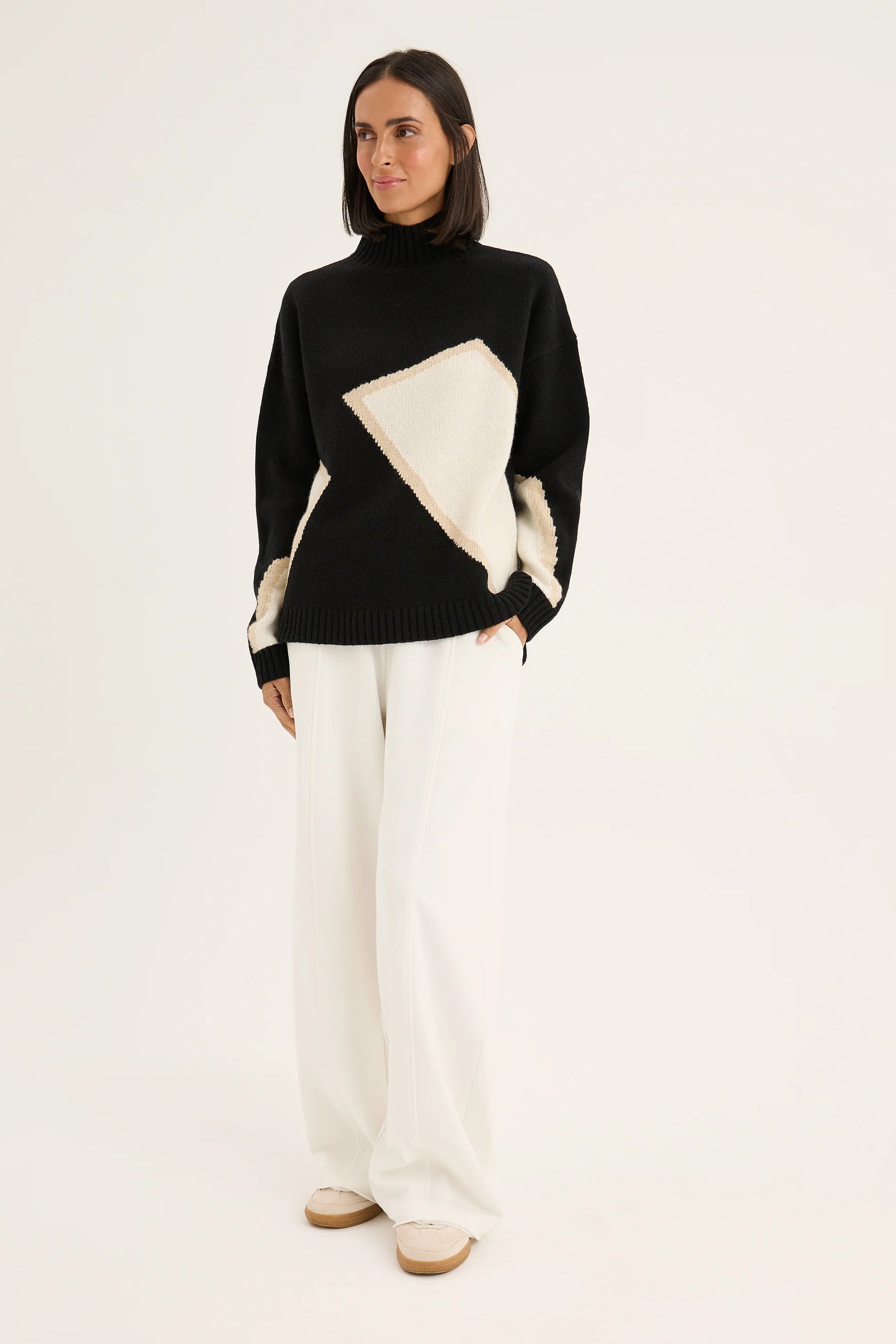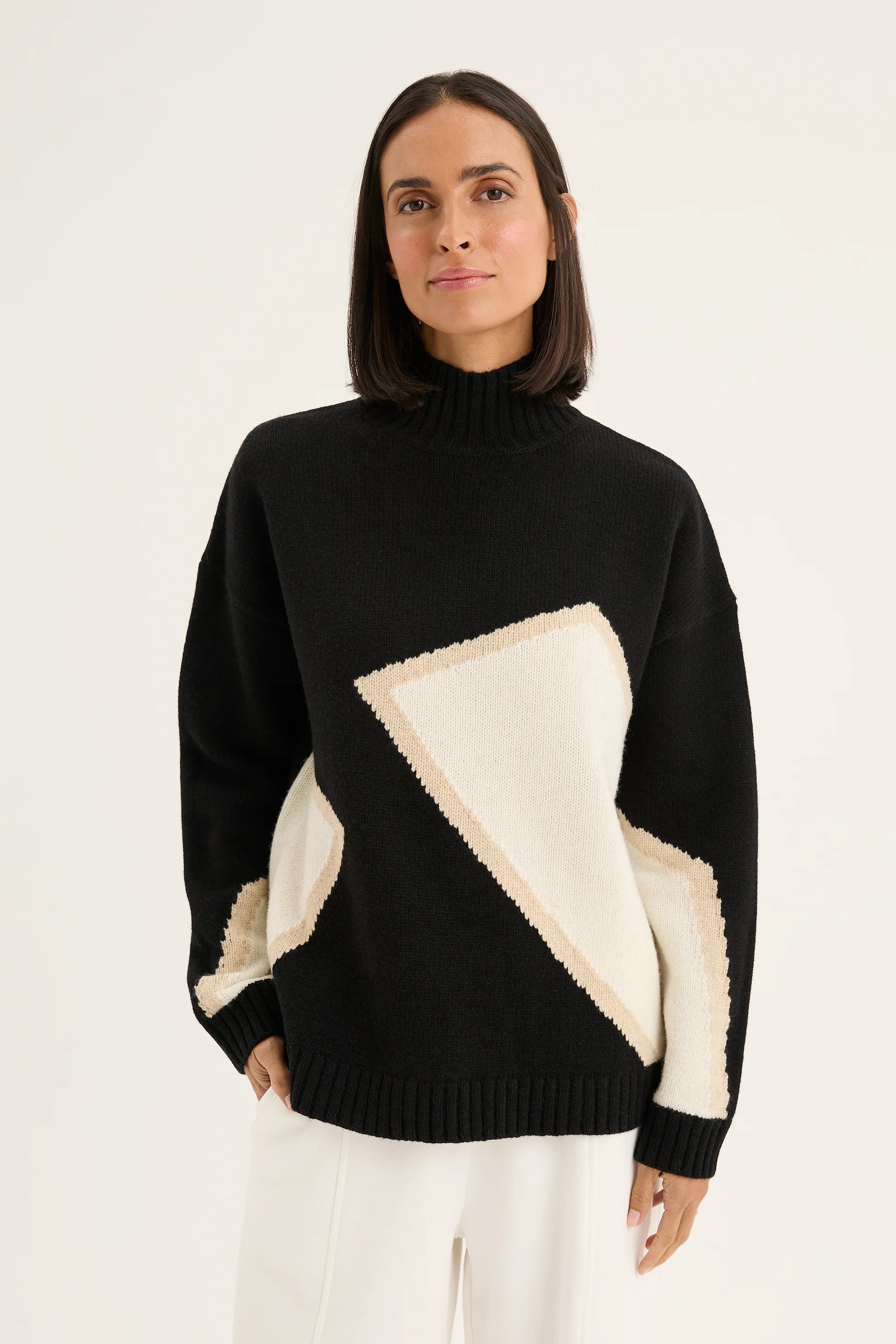 The Iceberg Knit showcases the graphic colourblock intarsias in contrast colours, brighten up any winter wardrobe. It’s crafted in relaxed fit, complemented seamlessly with turtleneck and long sleeves, enhancing comfort and warmth. Whether pair it with a wide-leg pant or cropped denim for a chic and modern twist ensembles.