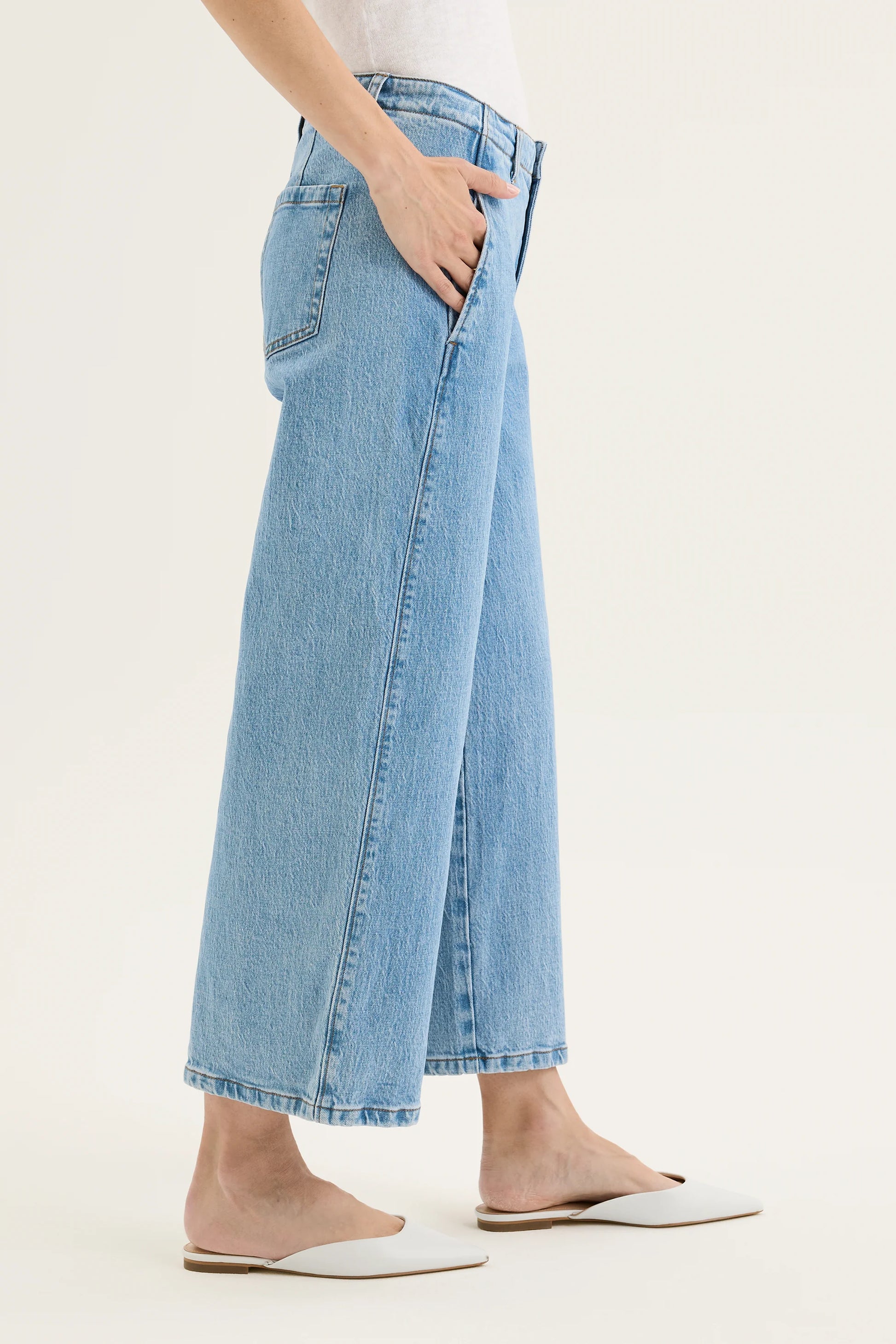 The Kiama Wide Leg Jean brings ease and elegance to everyday denim. Crafted from a soft stretch cotton in a light blue wash, it offers all-day comfort with a tailored feel - structured enough to hold its shape after wear and through the wash, while soft enough to move with you effortlessly. The full-length wide leg flatters any body type, while contrast topstitching adds depth and definition for a point of uniqueness in the design. Discreet in-seam front pockets and functional patch pockets at the back keep the silhouette minimal and refined. Finished with a classic zip-and-button fly and full belt.