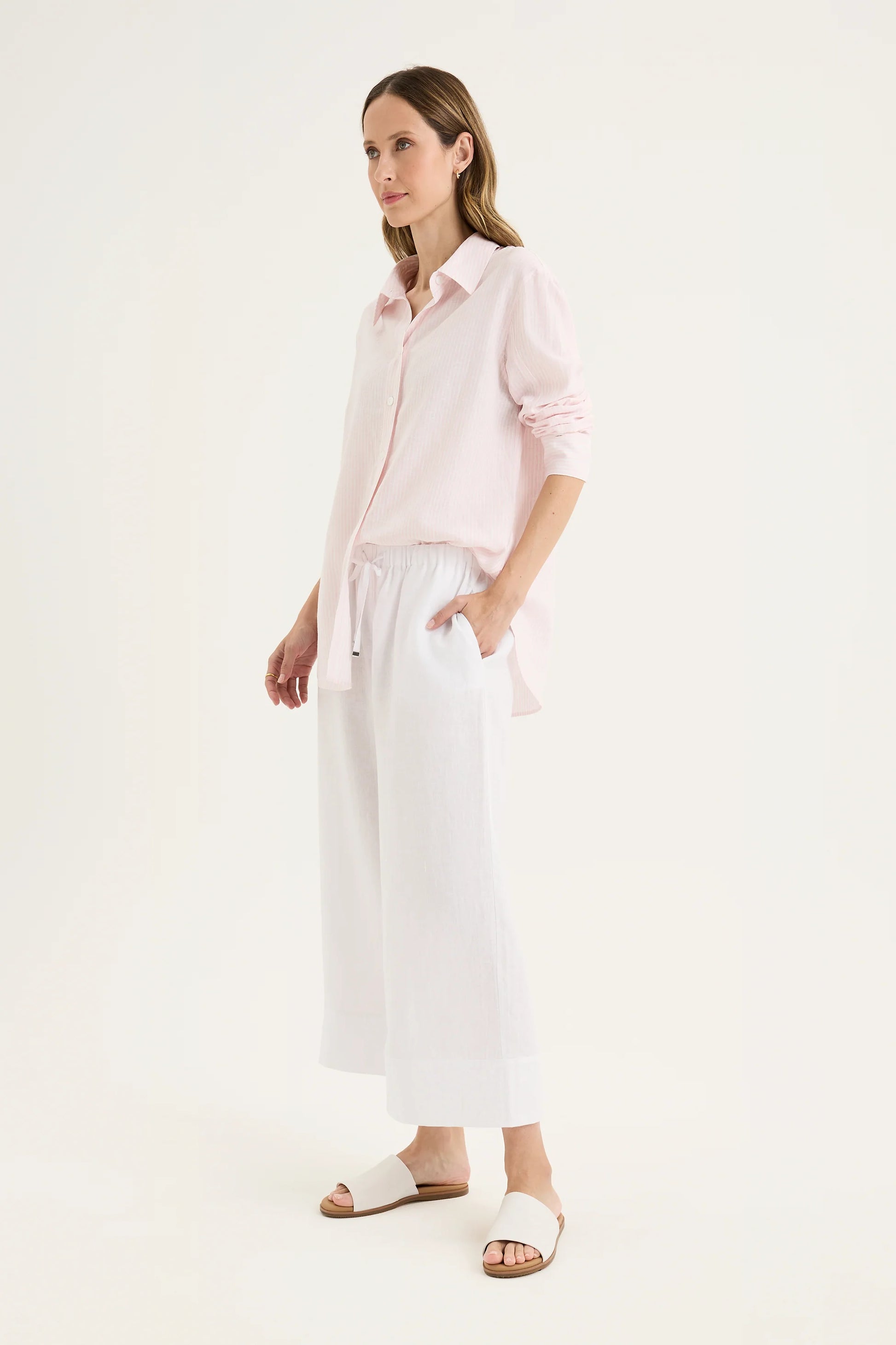 The Mornington Shirt is a refined take on the classic striped button-up. Crafted from a premium linen-viscose blend, it offers a soft, breathable feel and a naturally relaxed fit. Yarn-dyed vertical stripes create subtle length for a more flattering silhouette, while the curved hem and back yoke with an inverted pleat allow for extra movement and comfort across the shoulders. A traditional shirt collar, button-through front and tailored cuffs keep the look polished. Blending relaxed sophistication with timeless tailoring, it’s perfect for moments when you want something softer than a crisp cotton shirt, yet still suited to more elevated occasions.