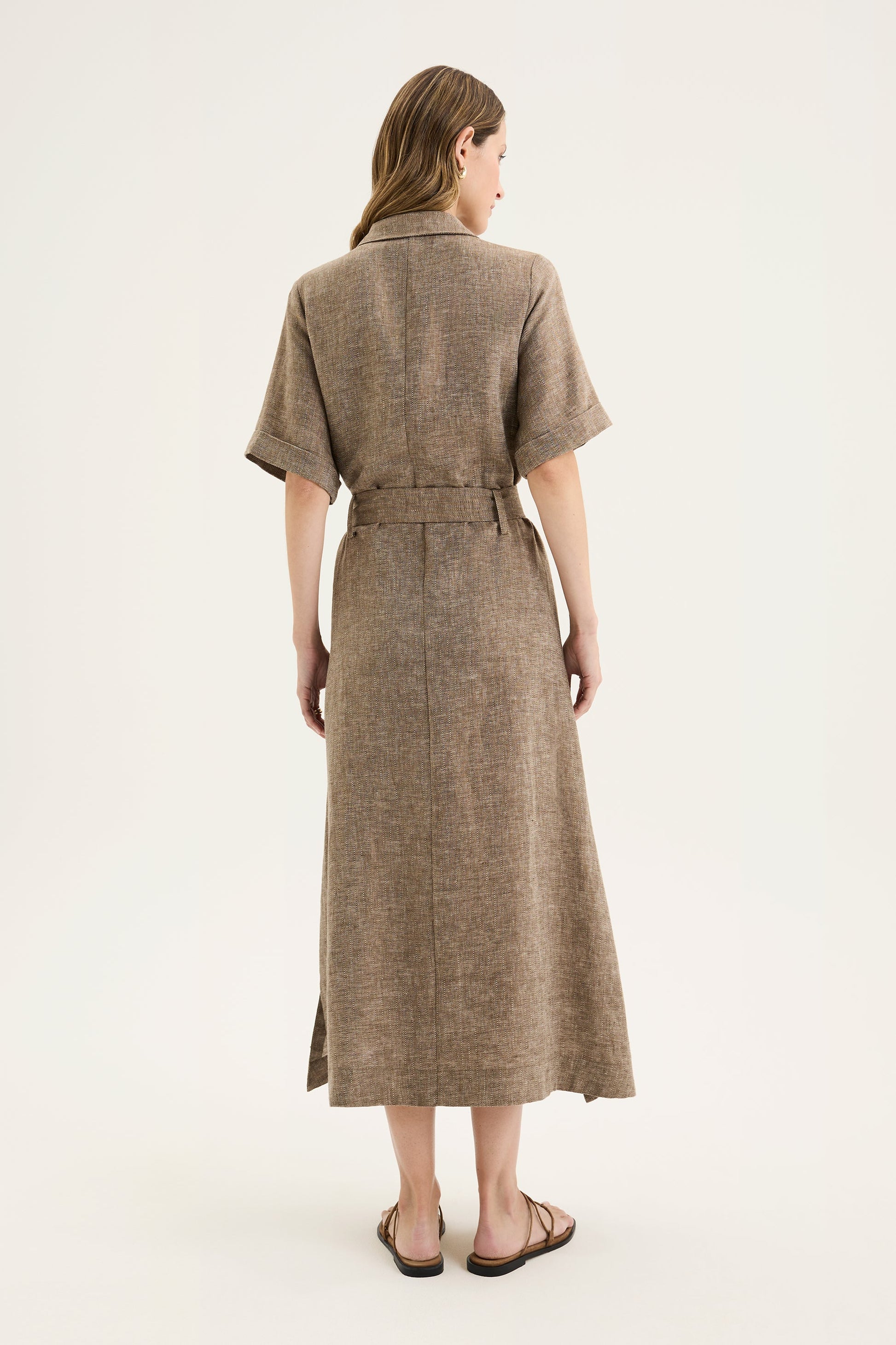 The Spina Dress strikes a considered balance between utility and summer ease. Crafted from a softly textured linen-cotton herringbone twill, it features a shirt collar, short sleeves with turned-up cuffs, and a full button-through front for effortless wear. The self-fabric waist tie threads through discreet belt loops, offering the option to define the silhouette or wear it loose for relaxed comfort. Finished with practical chest and side seam pockets and high hem splits for ease of movement, this above-ankle shirt dress is a versatile warm-weather staple—