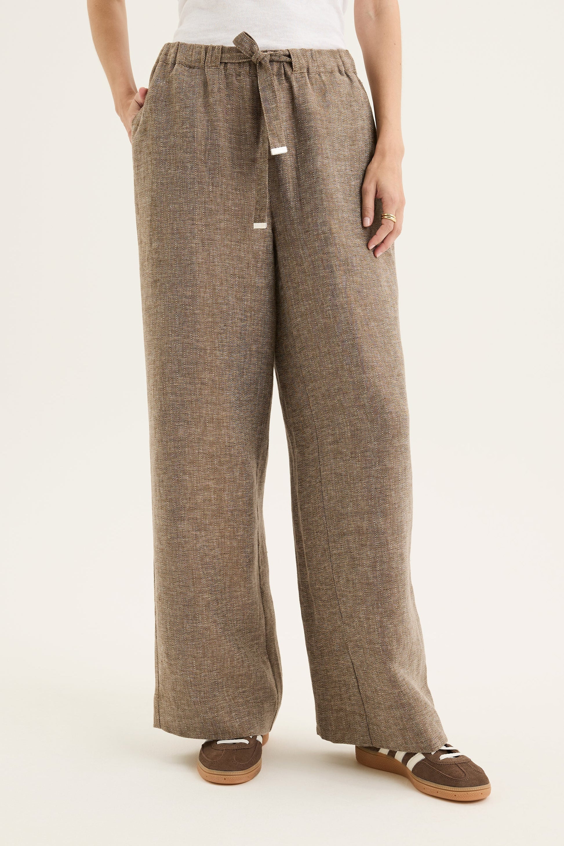 The Spina Pant offers relaxed tailoring in a softly textured herringbone twill. Made from a breathable linen-cotton blend, it has a naturally refined feel that’s easy to wear across seasons. The elasticated waistband with self-tie ensures comfort and flexibility, while functional inseam pockets and a full-length wide leg add to its effortless practicality. With its clean lines and earthy texture, it’s a versatile piece that moves seamlessly from everyday wear to more polished occasions.